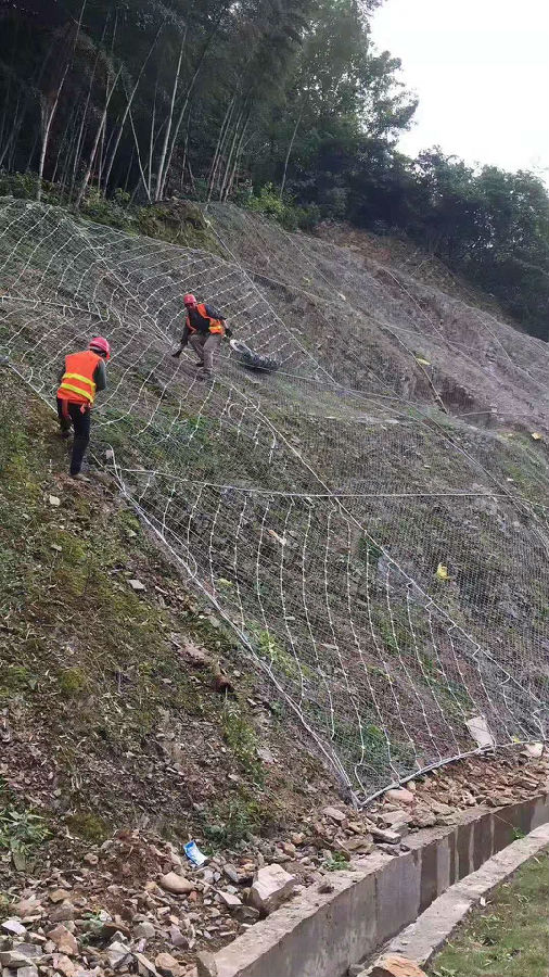 主動邊坡防護網(wǎng)又叫主動防護網(wǎng),主動防護網(wǎng)系統(tǒng)是以鋼絲繩網(wǎng)為主的各類柔性網(wǎng)覆蓋包裹在所需防護斜坡或巖石上,以限制坡面巖石土體的風化剝落或破壞以及危巖崩塌(加固作用),或?qū)⒙涫刂朴谝欢ǚ秶鷥?nèi)運動(圍護作用)。