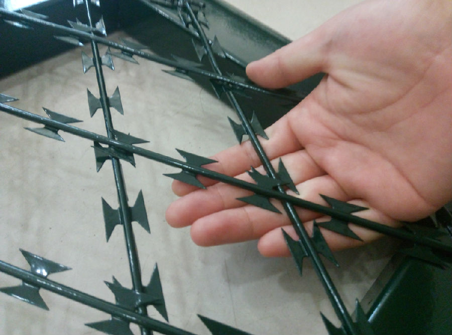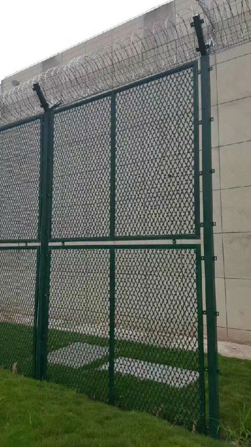 圍墻周界鐵絲網、焊接刀片隔離網工藝、焊接刀刺片圍網是非常重要的監區安全防護設施,是由焊接鋼網加蛇腹形刀刺網組合而成。產品具有結構新穎、堅固緊密、網面平整、網孔均勻、刀鋒銳利、防攀爬、性強等特點。Y型架上邊架蛇腹型刀刺:由熱鍍鋅鋼板或不銹鋼薄板沖壓出尖利的刀片狀,高張力鍍鋅鋼絲或者不銹鋼絲做芯線組合而成的阻盡器材。刀刺直徑采取50-60厘米,刀型整潔、刀片鋒利、排列均勻致密、連接堅固、防腐才能強,可能達到防攀越、防拆卸更高保險等級。